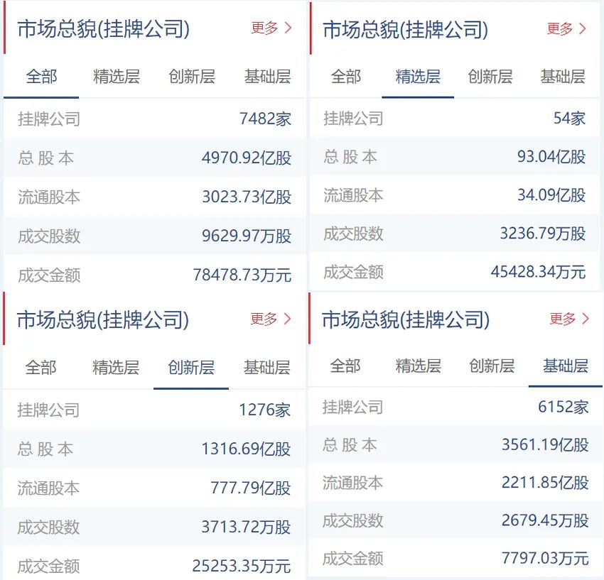 截至6月25日收盘,今日成交金额为7.85亿元,精选层成交金额为4.54亿元,创新层成交金额为2.53亿元,基础层成交金额为0.78亿元;今日成交股数为9629.97万股,精选层成交股数为3236.79万股,创新层成交股数为3713.72万股,基础层成交股数为2679.45万股。