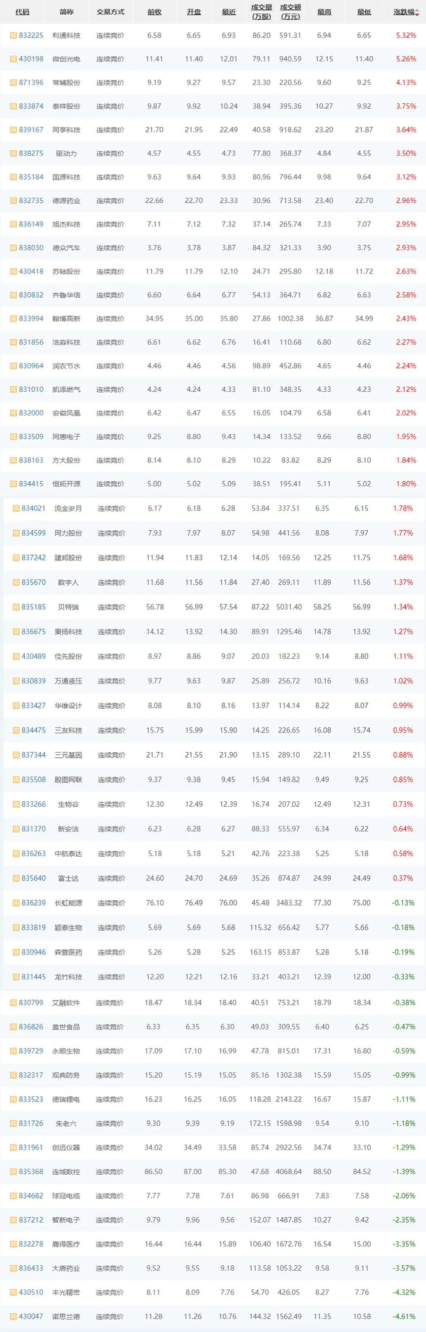 6月24日,精选层普涨,36家企业上涨,18家下跌。其中,利通科技(832225)上市首日涨幅居首,上涨5.32%;其次,微创光电(430198)上涨5.26%;诺思兰德(430047)跌幅居首,下跌4.61%;丰光精密(430510)居次下跌4.32%。