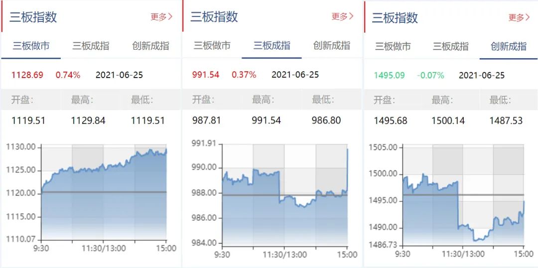 截至6月25日收盘,三板做市报1127.69点,上涨0.74%;三板成指报991.54点,上涨0.37%;三板创新报1495.08点,下跌0.07%。