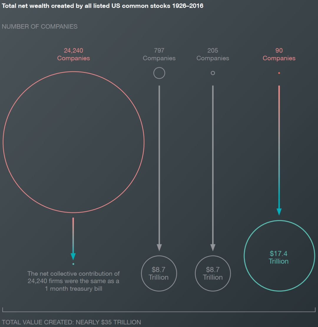 随后,这项研究被扩展到1990年至2018年之间参与股市交易的62000多家公司,其结果更为集中——只有1%的企业与股票共同创造了这期间内的净收益,数额高达45万亿美元,其余股票的价值则消失在了企业发展与金融交易的长河中。