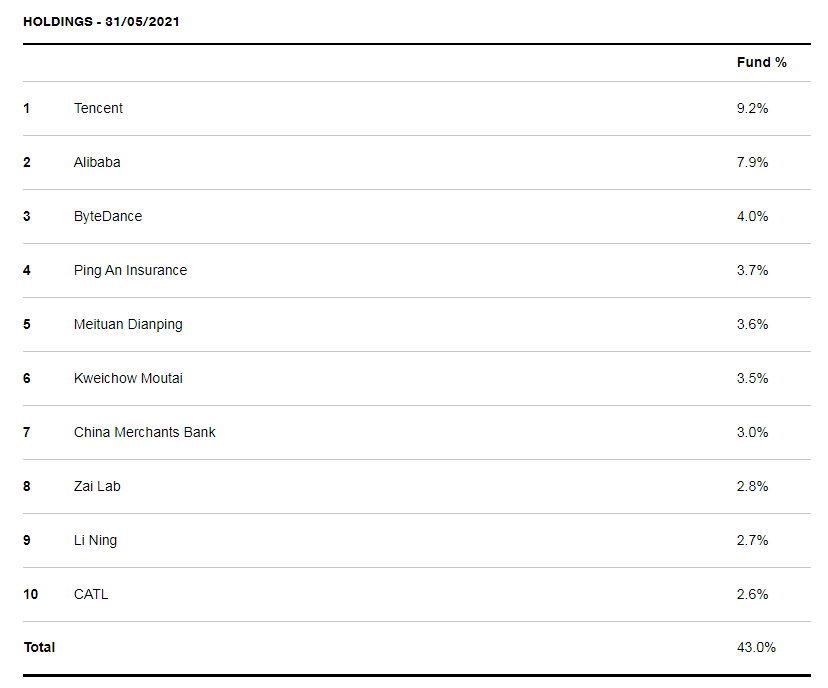截至今年5月31日,柏基在中国的投资阵容堪称豪华,排行前十的重仓股分别是腾讯、阿里、字节跳动、平安、美团、茅台、招商银行、再鼎医药、李宁、宁德时代。不仅赛道丰富精准,总规模也高达2.63亿英镑(约24亿人民币,规模数据截至3月31日),前十重仓股则占据了柏基在中国投资总仓位的43%。