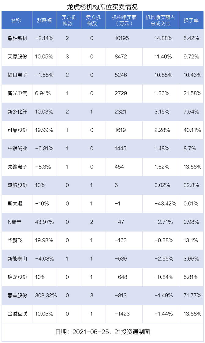 6月25日,16只个股龙虎榜出现了机构的身影,机构合计净买入2.89亿元。具体来看,机构净买入9股,净卖出7股。