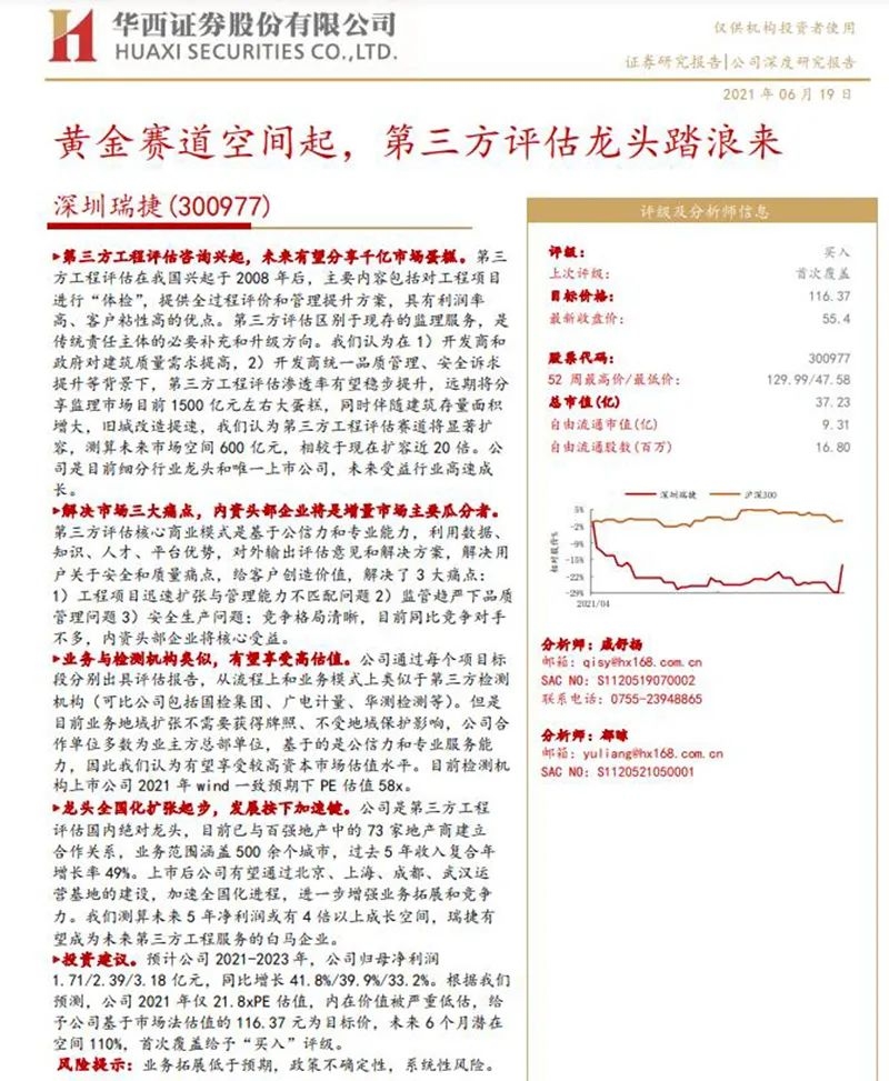 然而,华西证券6月19日发布的一篇题为《深圳瑞捷:黄金赛道空间起,第三方评估龙头踏浪来》的研报引起市场注意。Choice数据显示,这是深圳瑞捷上市后获券商发布的首份深度研报。