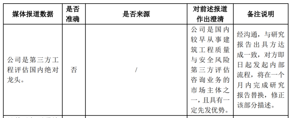 6月24日晚间,深圳瑞捷正式回应了此事。公司表示,研报指出的“公司是第三方工程评估国内绝对龙头”这一数据不够准确,经沟通,公司与研究报告出具方达成一致,对方即日起发起内部流程,将在一个月内完成研究报告替换,修正该部分描述。