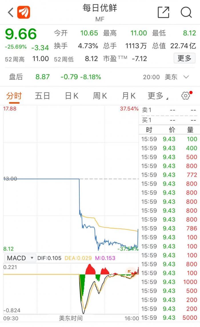 更为严重的是,每日优鲜盘后继续下挫8.18%,报价8.87美元,相当于每日优鲜真实暴跌为31.77%,市值蒸发9.72亿美元。即使买入100股,也相当于一夜亏413美元,折合3200港元。