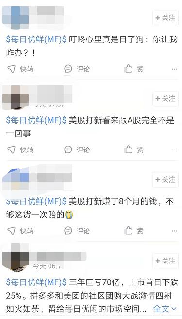 对于每日优鲜暴跌,有股民评论道,“虽然大部分新股都能赚钱,但需要躲开这种大雷才行,相信这次很多散户把美股打新赚的钱全亏完了”,而另一个股民直接呼应了上面这位股民,“美股打新赚了8个月的钱,不够这货一次赔的”。