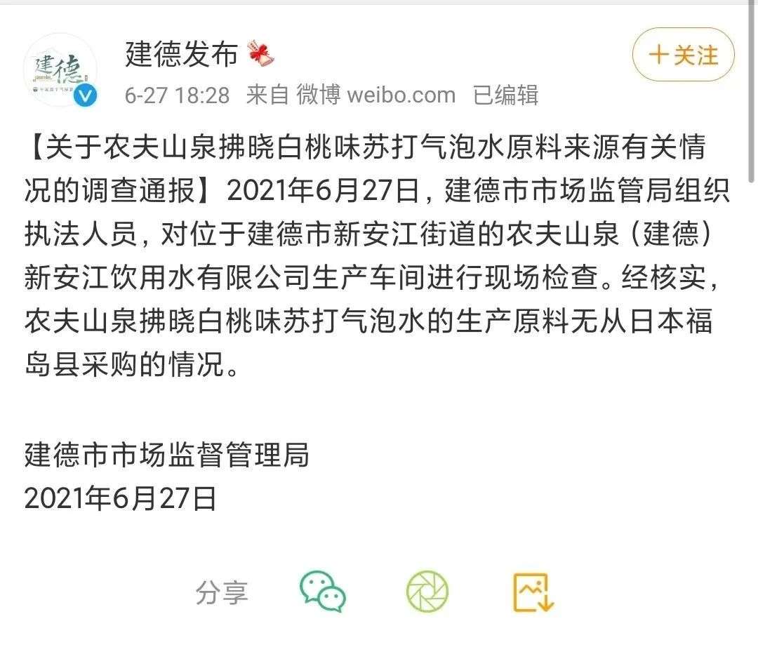 此后,浙江建德市市场监督管理局也发布检查结果:经核实,确认农夫山泉拂晓白桃味苏打气泡水的生产原料无从日本福岛县采购的情况。即农夫山泉在配料中并没有使用宣传所提到的“产自日本福岛的拂晓白桃。