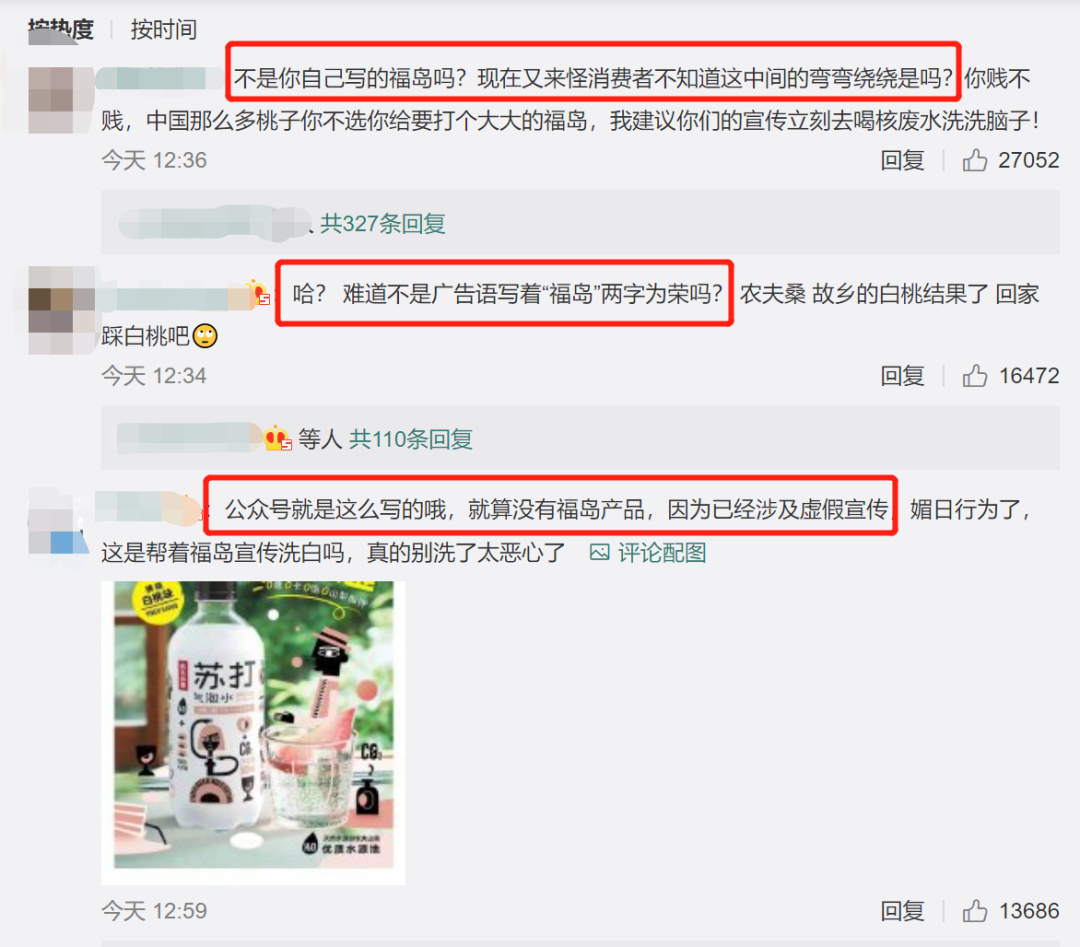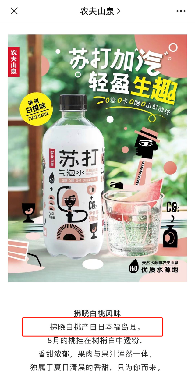 6月27日,有媒体爆出,农夫山泉旗下“拂晓白桃味苏打气泡水”的宣传海报中,其原料之一竟为产自日本福岛县的拂晓白桃。