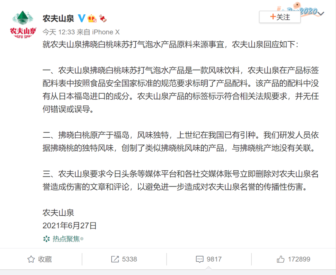 一方面,农夫山泉在公告中表示该产品为使用国内原料制作而成,而却在其官方微信公众上白底黑字的显示着“拂晓白桃产自日本福岛县,8月的桃挂在树梢白中透粉……”。