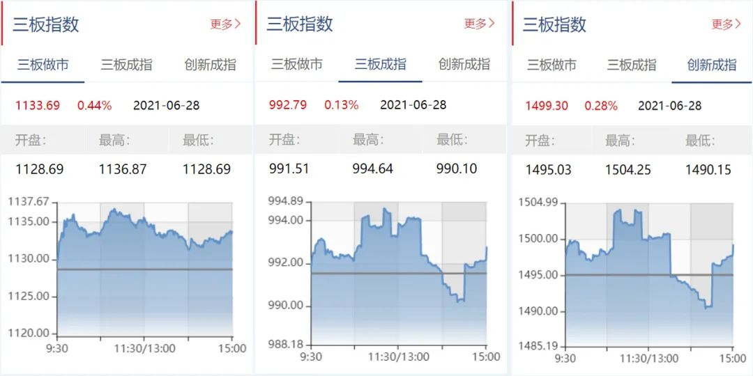 截至6月28日收盘,三板做市报1133.69.69点,上涨0.44%;三板成指报992.79点,上涨0.13%;三板创新报1499.30点,上涨0.28%。