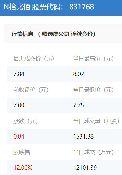 从今日盘面上看,拾比佰表现良好。今日以7.00元/股的价格开盘,盘中最高价8.02元,最低价7.75元。今日报收7.84元/股,上涨12.00%。单日成交额达1.21亿元,单日换手率29.91%。