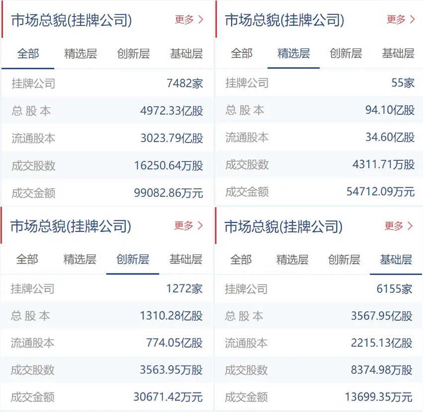 新三板挂牌公司总计7482家(精选层55家,创新层1272家,基础层6155家),总股本4972.33亿股,流通股本3023.79亿股。