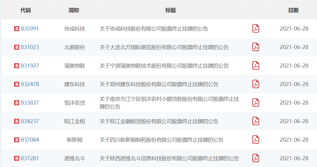 6月28日,全国股转公司消息,新三板基础层企业协成科技(835991)、北展股份(831023)、瑞奥物联(831927)等8家公司终止挂牌。