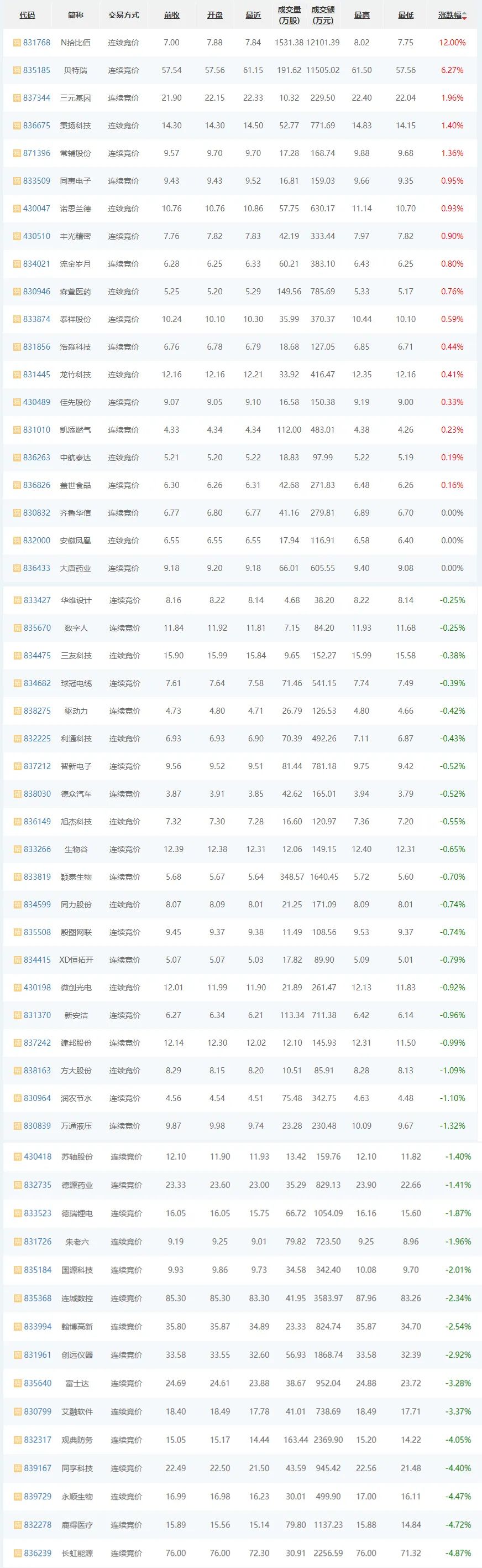 6月28日,精选层普跌,17家企业上涨,3家平盘,35家下跌。其中,拾比佰(831768)上市首日涨幅居首,上涨12.00%;其次,贝特瑞(835185)上涨6.27%;长虹能源(836239)跌幅居首,下跌4.87%;鹿得医疗(832278)居次下跌4.72%;齐鲁华信(830832)、安徽凤凰(832000)等平盘。