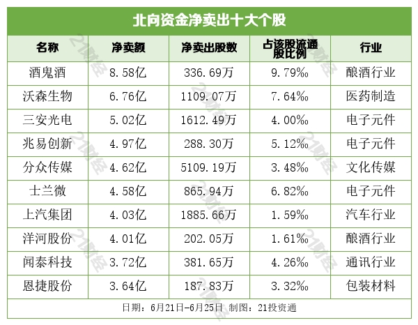 北向资金净卖出酒鬼酒(000799.SZ)、沃森生物(300142.SZ)、三安光电(600703.SH)、兆易创新(603986.SH)、分众传媒(002027.SZ)居前。