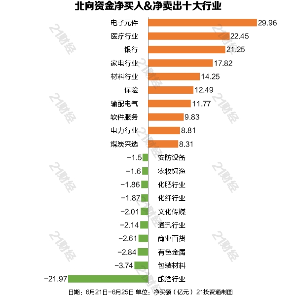 北向资金减持了14个行业,其中酿酒行业最多,净卖出金额达21.97亿元,其次是包装材料行业,净卖出3.74亿元。