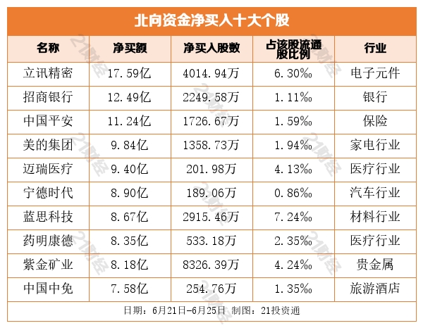 个股方面,北向资金净买入立讯精密(002475.SZ)、招商银行(600036.SH)、中国平安(601318.SH)、美的集团(000333.SZ)、迈瑞医疗(300760.SZ)居前。