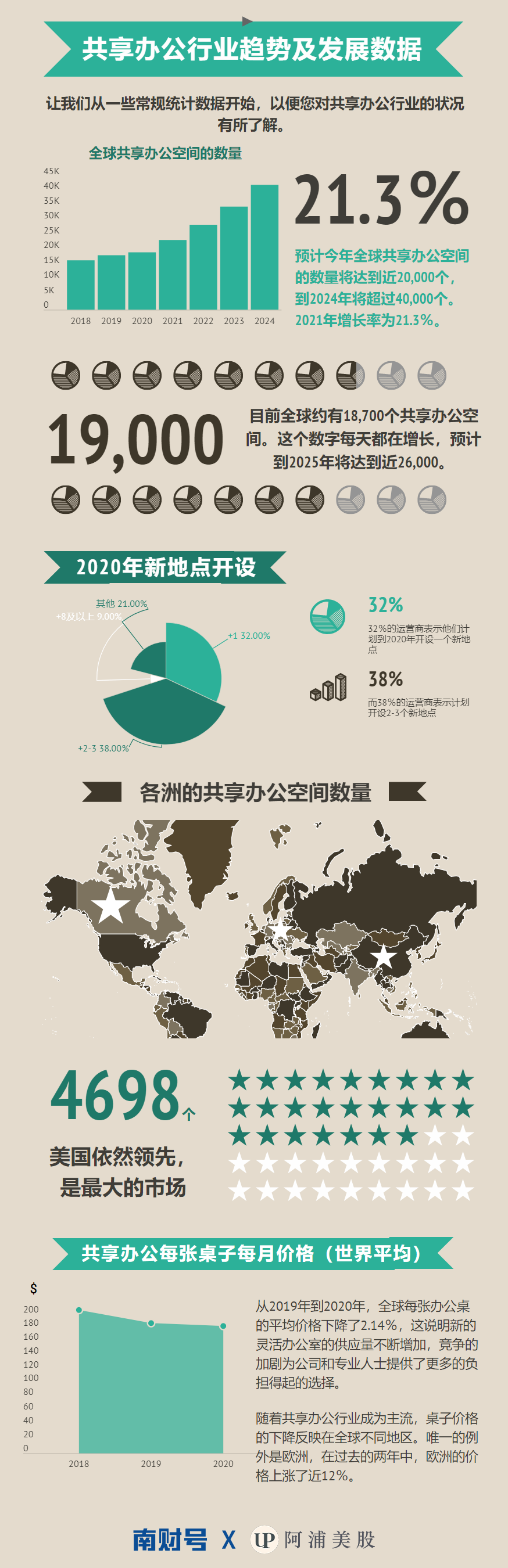 数量:自2018年以来,全球共享办公室的数量不断增加,预计2021年的增长率为21.3%,至2021年年末全球共享办公室的数量将高达20000个。
