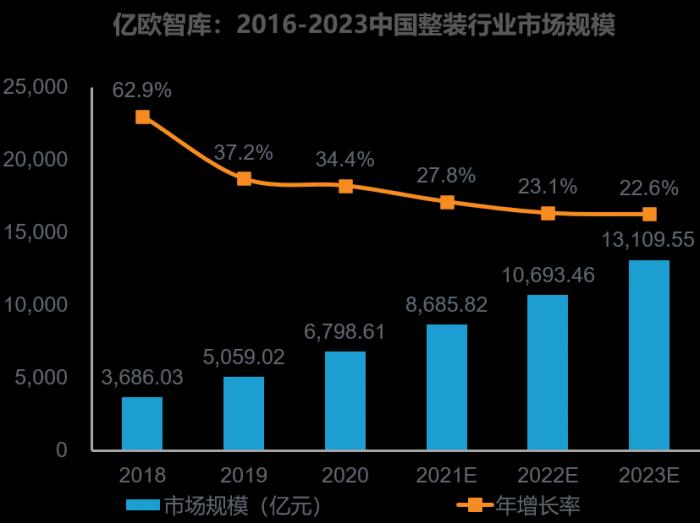 而亿欧智库数据亦显示,预计2021年整装行业的市场规模将达到8685.82亿元,并将持续保持20%以上的年增速高速发展,有望在2022年突破万亿。未来无论新房、存量房在中国整体对家装行业的驱动力度较弱,这代表着家装行业已经结束了“以房为本”的发展契机。取而代之的是现在及未来必将进入深度围绕消费者的“以人为本”时代,深刻理解消费者需求,并为他们解决问题,或许会给家装行业的品类、模式、渠道带来重大改变。