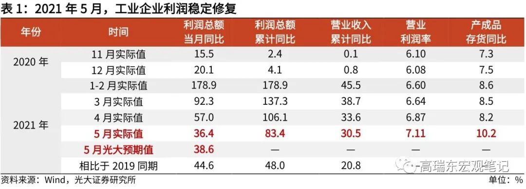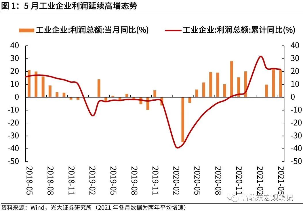 2021年5月,工业企业利润同比增长36.4%,受去年同期基数逐步抬高影响,增速较4月份回落20.6个百分点。与2019年同期相比,利润增长44.6%,两年平均增长20.7%,于4月份基本持平,企业利润持续稳定增长,基本延续了2020年下半年以来较快增长态势。