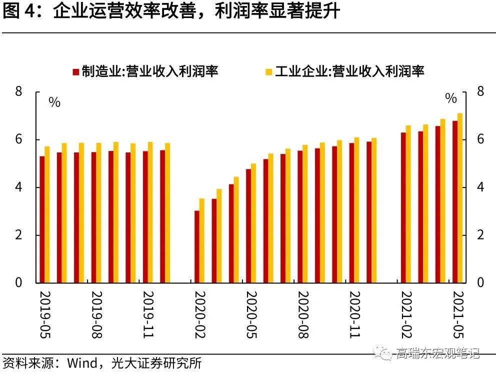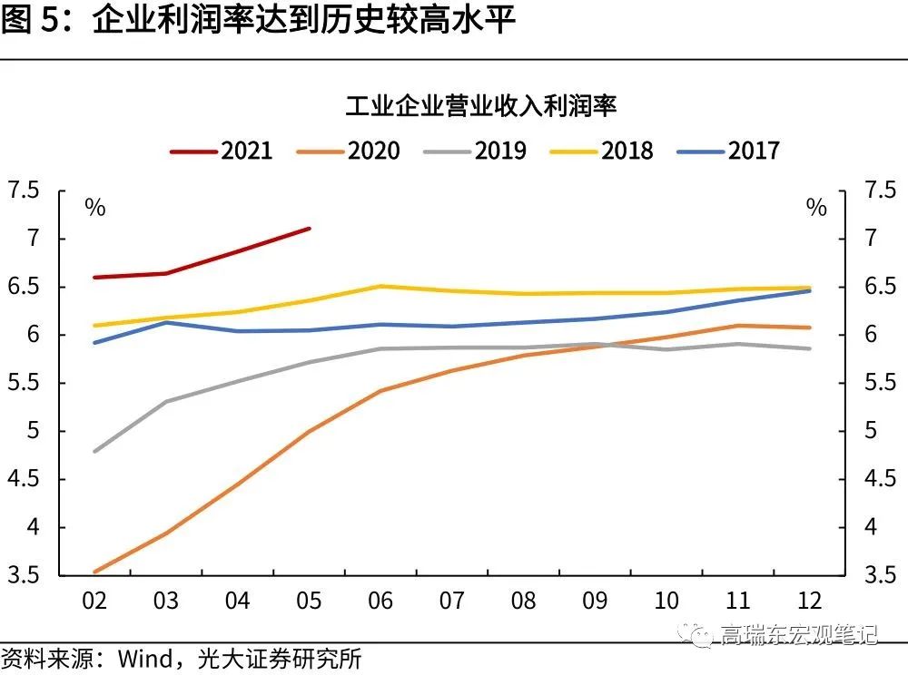 三是,企业运营效率改善,利润率显著提升。2021年1-5月,规上工业企业营业收入利润率为7.11%,比1-4月提升0.24个百分点,同比提高2.11个百分点,比2019年同期提高1.39个百分点,利润率达到历史较高水平。
