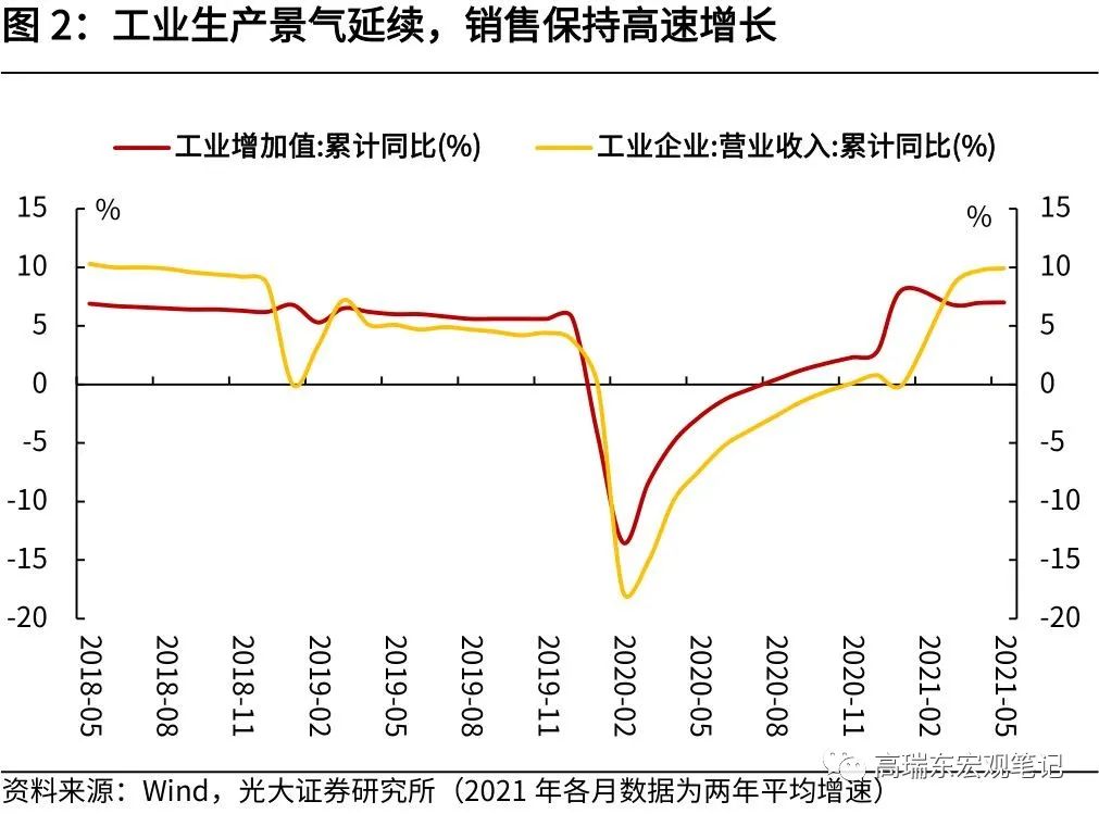 一是,生产销售较快增长,为企业效益改善奠定良好基础。2021年5月,规上工业增加值同比增长8.8%,比2019年同期增长13.6%,两年平均增长6.6%,与4月基本持平,工业生产延续了稳定恢复的良好态势;营业收入增长33.6%,相比于2019年同期增长20.8%,两年平均增长9.9%。生产销售均实现高速增长,有力推动企业利润扩张;