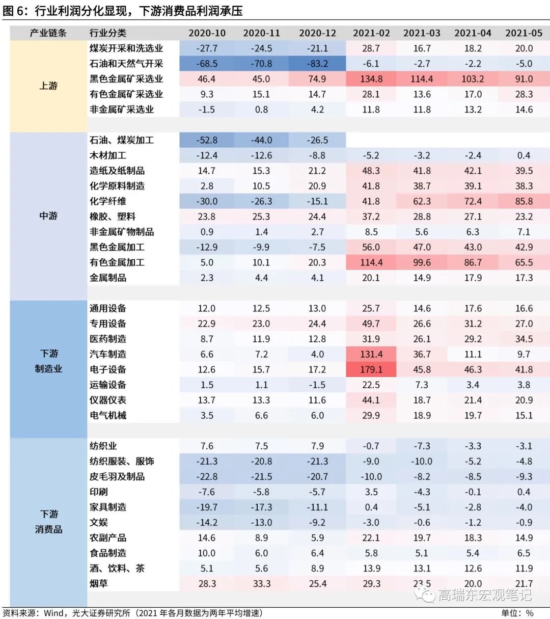 中上游:企业利润普遍增长,利润扩张加快。受市场需求改善、大宗商品价格上涨等因素推动,上游采矿业和原材料制造业利润增长明显加快。2021年1-5月,采矿业利润同比增长135.5%,比2021年1-4月加快32.5个百分点;原材料制造业利润同比增长111%,两年平均增长32.0%,显著高于规上工业平均水平,带动企业盈利较快增长。其中,黑色金属、有色金属冶炼和压延加工业、化学原料和化学制品制造业利润增长较快,两年平均增速均在31%—68%之间,与2021年1-4月相比,中上游行业利润继续维持在高增区间。