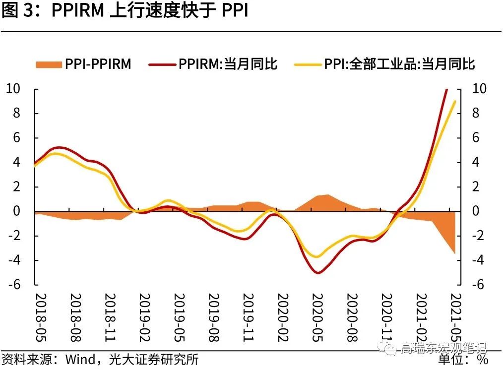 二是,工业品价格继续上行,拉动中上游企业利润扩张,但下游企业利润承压。2021年5月,PPI同比增长9.0%,PPIRM同比增长12.5%,PPIRM上行速度大幅快于PPI,原材料价格的上升拉动中上游企业利润扩张,但下游企业利润受到挤压;