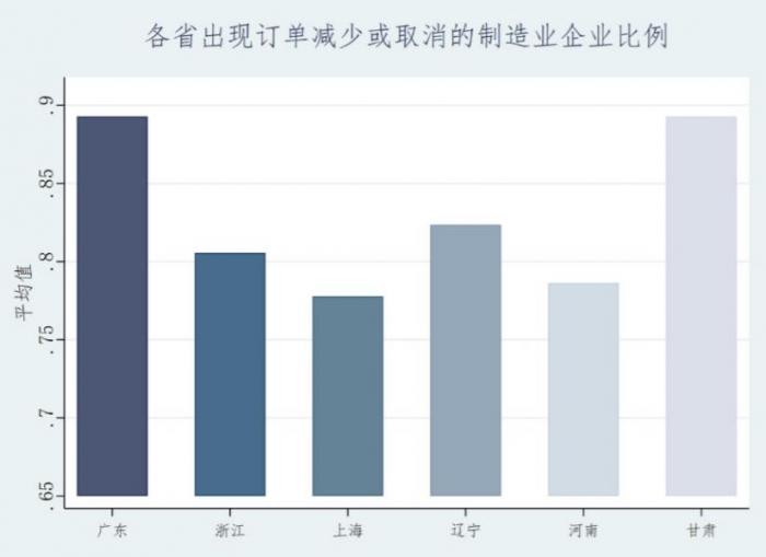 从区域对比的情况来看,广东和甘肃出现订单减少或取消的制造业企业比例最高,且明显高于浙江、上海、辽宁和河南。