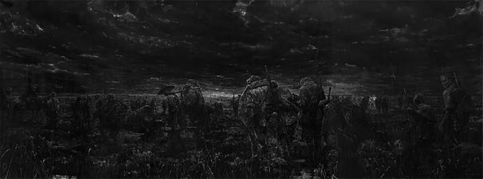 作品展现了红军过草地的意境和气魄。整个画面是阴暗的,天空乌云密布,远处的霞光隐约闪现,象征着胜利的曙光,是战士们砥砺前行的不竭动力。在塑造战士人物形象上,突显战士的背影,而非以战士的脸面、身体的正面为呈现元素。战士背对观者,低头寻路,艰难跋涉,远处出现几匹孤零零的战马。众多战士的背影汇集成一条线,直指远方,渐行渐远,预示着征途不息、战斗不止、奔往胜利。