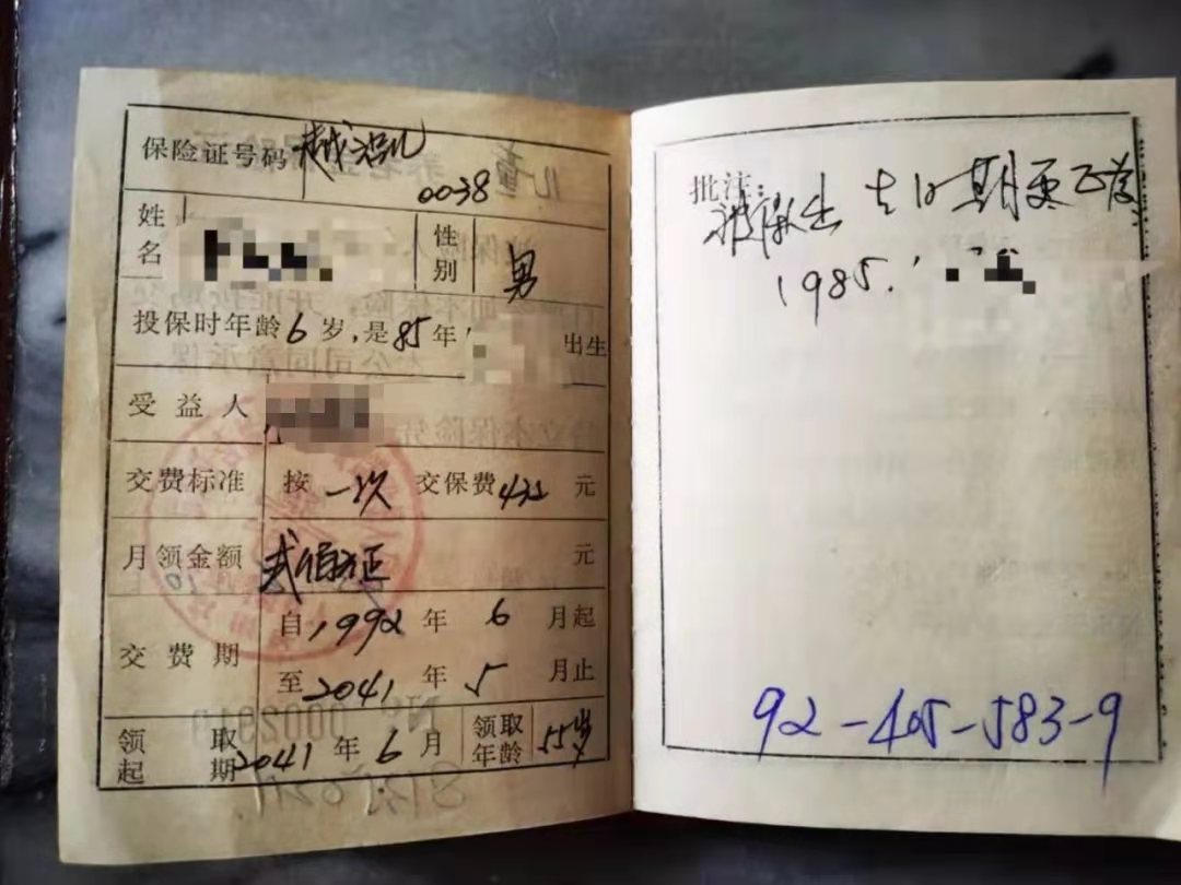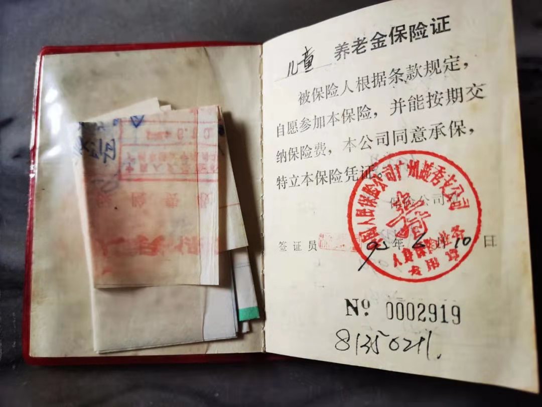打开这个保单,有一种打开文物的感觉,泛黄的纸片,红色的外胶套上印着《养老金保险证》,内有钢笔字迹写在印刷的小格子里,好有计划经济时代的怀旧感。