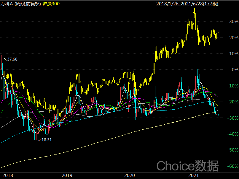 即使是行业一哥万科,过去几年中,股价只能勉力追上沪深300——万科的股价在2018年1月创下新高之后,再也没有回到高点,股价距离高点跌了接近35%。