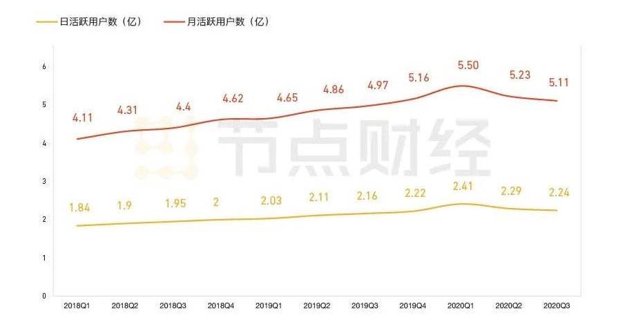 根据最新财报显示,2021年3月,微博月活跃用户数达5.3亿,同比下降4%,环比增长2%;平均日活跃用户达到2.3亿,同比下降5%,环比增长2%。如图所示,从2018年Q1-2020年Q3,无论是日活跃用户数还是月活跃用户数,微博的增长都趋近平缓,只有疫情期间增长明显,随后便回落。