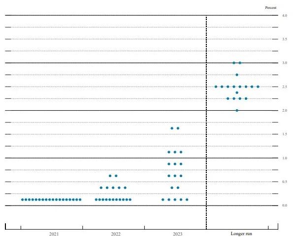 利率方面,点阵图隐含提前加息可能,2023年内可能至少加息两次。参考反映美联储未来利率政策的点阵图可看出,美联储官员在3月会议时普遍认为将至少维持零利率政策至2023年底。而此次会议点阵图有较大变化,6月会议点阵图显示大部分官员都预测2023年内可能提前加息,甚至是预测2022年加息的官员也比3月时明显增多。另外,2023年利率预测中枢从3月的0.1%抬升至0.6%,意味着2023年内美联储可能会有至少两次加息操作。
