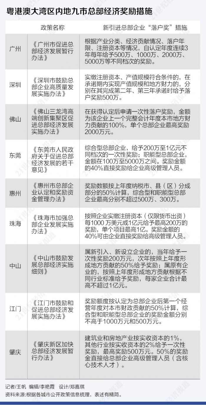 对总部企业给予奖励,这并非深圳独有的动作。21世纪经济报道记者梳理,近几年来,粤港澳大湾区内地9市均出台过促进总部经济发展的措施。