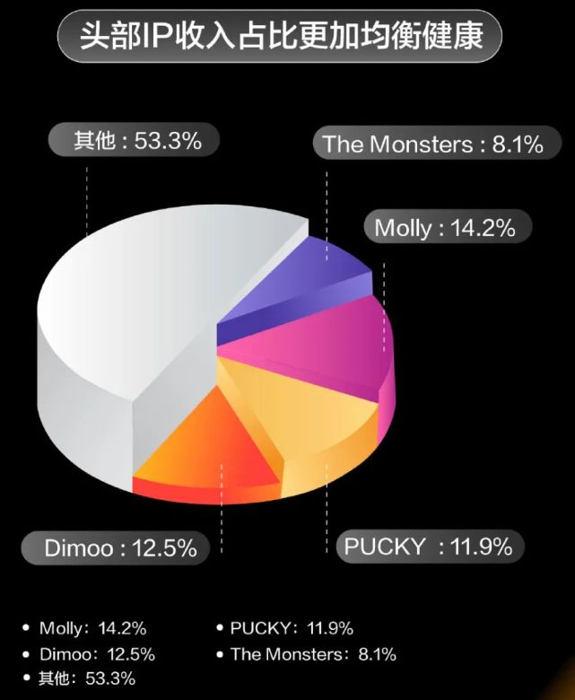 泡泡玛特的IP形象中,留给大众印象最深的莫过于Molly、Dimoo和PUCKY。虽然品牌有90多个IP形象,但是Molly绝对是最强王者。对于其他自研产品的营收,都赶不上这三款IP的占比。