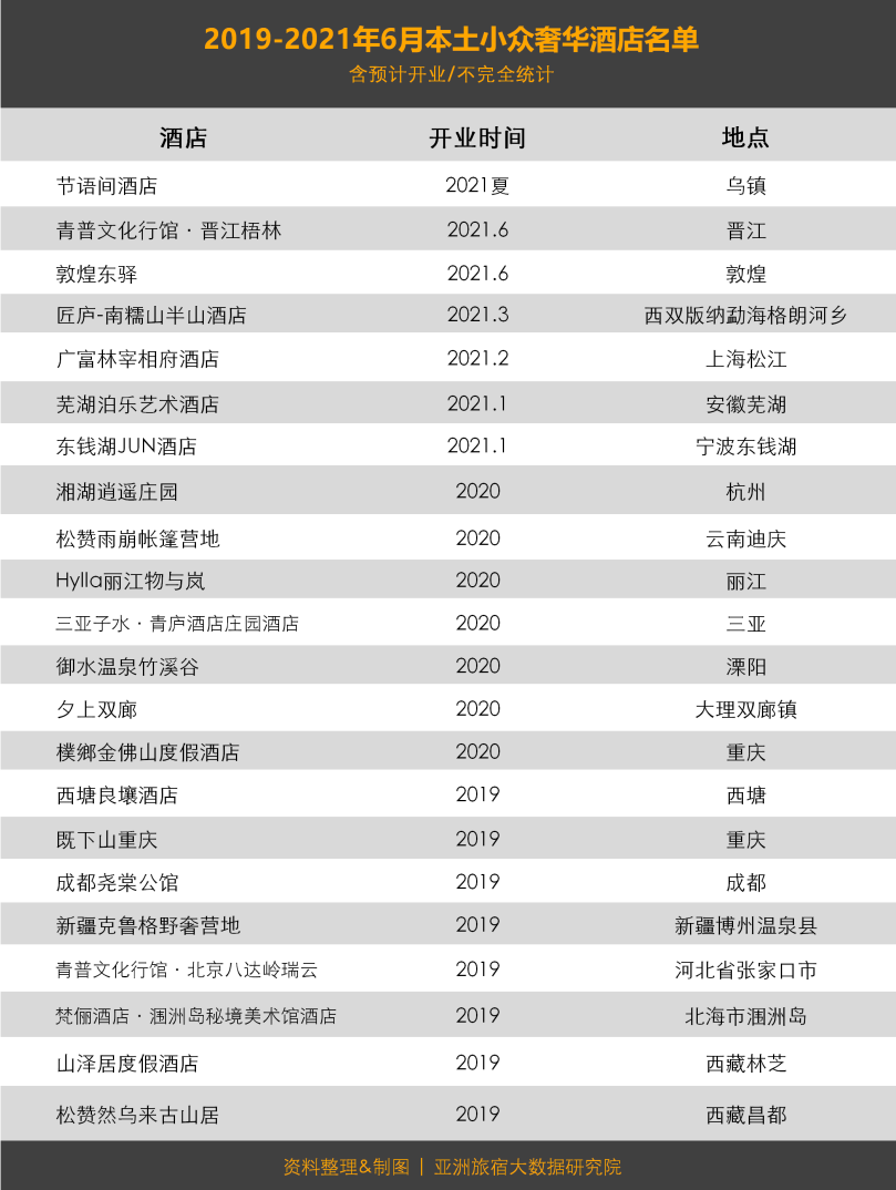 根据亚洲旅宿大数据研究院给出的数据,2021年上半年以来,开业的本土小众奢牌酒店就有7家,仅半年的数据,就已与2020年(7家)持平,比2019年的8家少1家。
