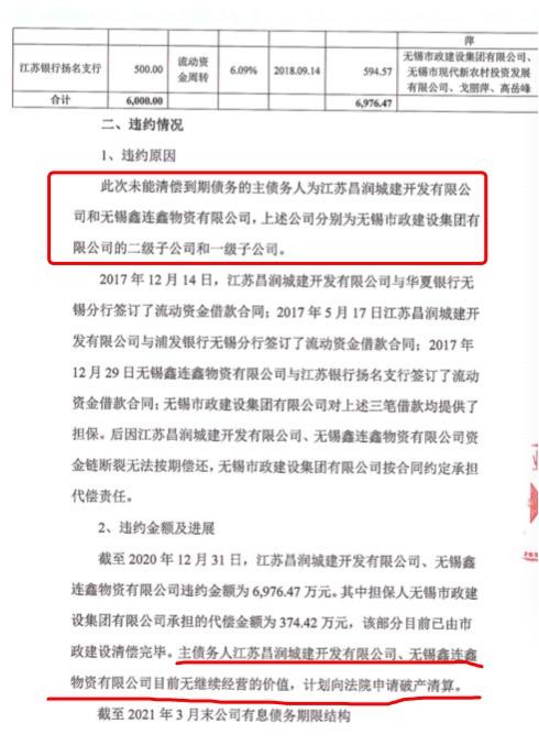 公告还称,主债务人江苏昌润城建开发有限公司,无锡鑫连鑫物资有限公司,目前无继续经营的价值,计划向法院申请破产清算。