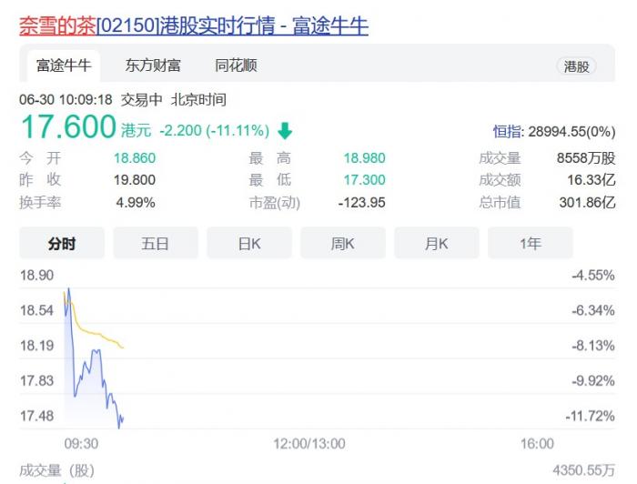 6月30日,奈雪的茶(02150.HK)在香港敲钟上市,开盘报18.86港元,IPO价19.80港元。截至早上10点,奈雪股价报17.8港元,较发行价低10.1%,目前总市值301.86亿港元。