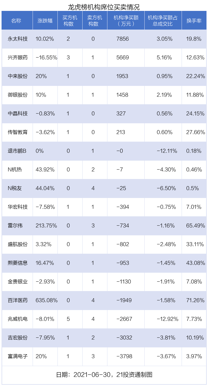 6月30日,18只个股龙虎榜出现了机构的身影,机构合计净买入1986.02万元。具体来看,机构净买入6股,净卖出12股。