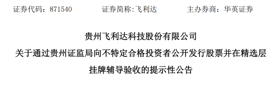2021年6月29日,贵州证监局下发《贵州证监局关于华英证券有限责任公司对贵州飞利达科技股份有限公司辅导工作的无异议函》。飞利达在华英证券有限责任公司的辅导下,已通过贵州证监局的辅导验收。