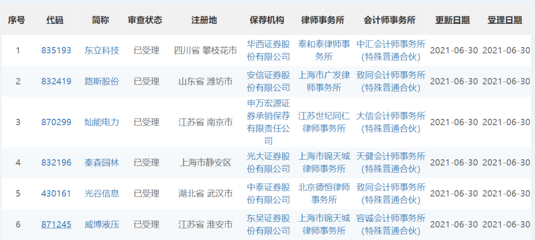 今日6家材料获受理企业分别为东立科技(835193)、路斯股份(832419)、灿能电力(870299)、秦森园林(832196)、光谷信息(430161)、威博液压(871245)。