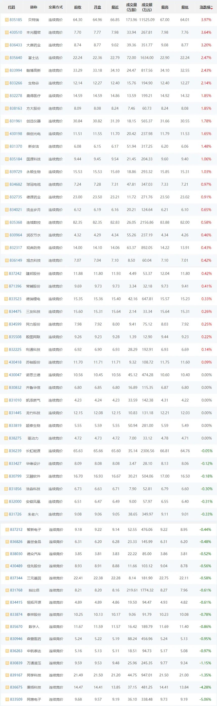 6月30日,精选层涨跌互现,28家企业上涨,6家平盘,21家下跌。其中,贝特瑞(835185)上市首日涨幅居首,上涨3.97%;其次,丰光精密(430510)上涨3.64%;同惠电子(833509)跌幅居首,下跌5.06%;秉杨科技(836675)居次下跌4.2%;诺思兰德(430075)、齐鲁花心(830832)等平盘。