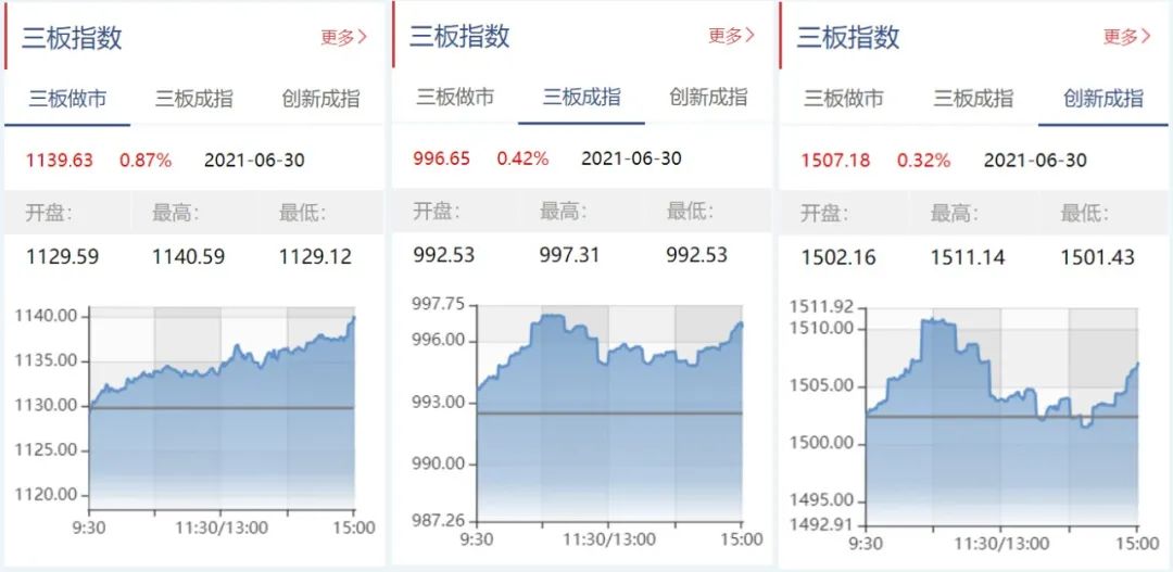 截至6月30日收盘,三板做市报1139.63点,上涨0.87%;三板成指报996.65点,上涨0.42%;三板创新报1507.18点,上涨0.32%。