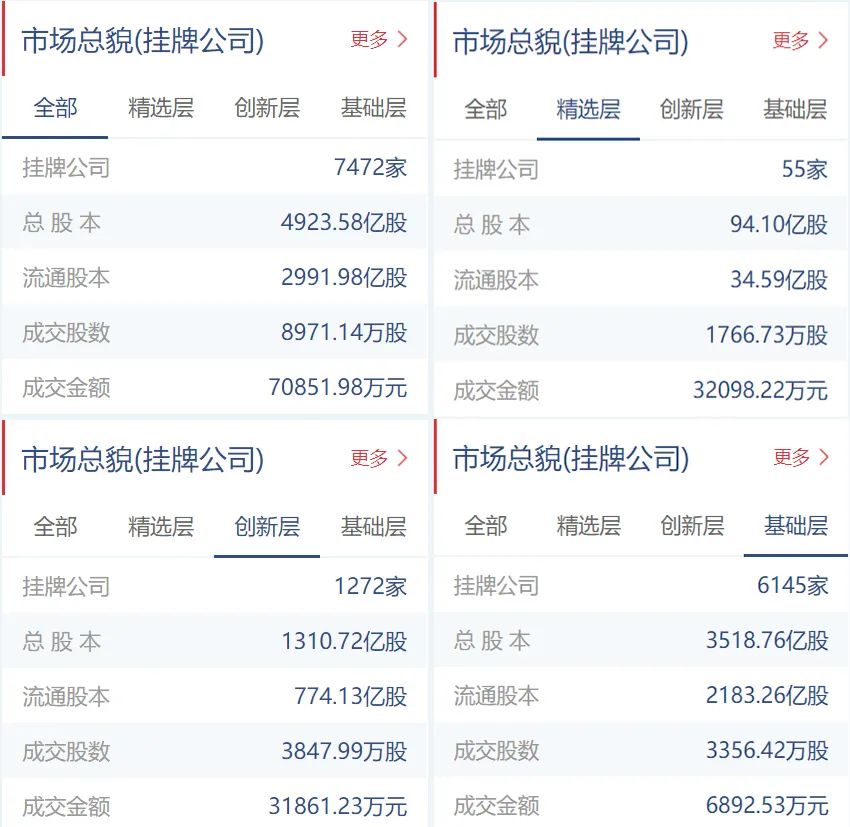 截至6月30日收盘,今日成交金额为7.09亿元,精选层成交金额为3.21亿元,创新层成交金额为3.19亿元,基础层成交金额为0.69亿元;今日成交股数为8971.14万股,精选层成交股数为1766.73万股,创新层成交股数为3847.99万股,基础层成交股数为3356.42万股。