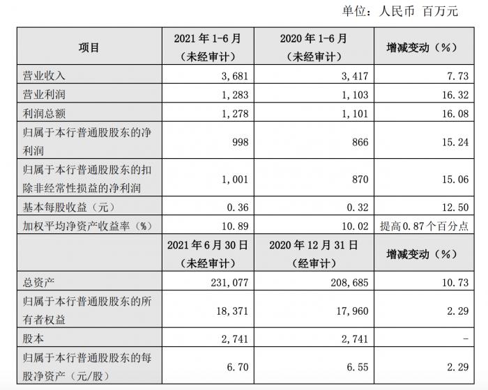具体来看,截至6月末,常熟银行总资产为2310.77亿元,较2020年末增长10.73%;营业收入、归属于上市公司净利润分别为36.81亿元、9.98亿元,增速为7.73%、15.24%。