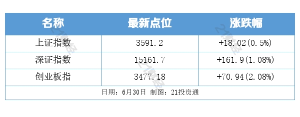 昨日,A股迎来上半年收官战,三大指数集体收涨,其中沪指上涨0.50%,收报3591.20点,上半年累计上涨3.40%;深证成指上涨1.08%,收报15161.70点,上半年累计上涨4.78%;创业板指走势较强,涨幅达到2.08%,收报3477.18点,创2015年6月以来的六年新高,上半年累计涨幅达到17.22%。