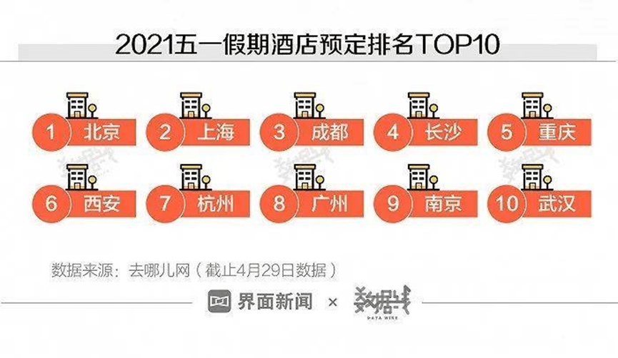 以酒店行业为例,截止2021年4月份,长沙的酒店预定量位列全国第四,五一期间酒店均价达到422元,较2019年同期每晚均价还增长122元,增幅超过40%,其中高星酒店占比达到28%。