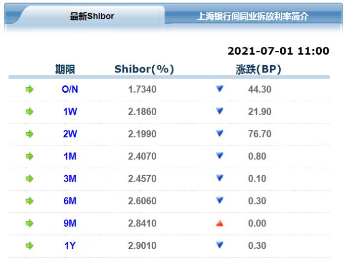 上海银行间同业拆借利率(Shibor),1日也是全线下跌,隔夜Shibor下跌44.3个BP,目前报1.734%,明显低于央行今年以来始终维持的2.2%逆回购操作利率。一周品种下跌21.9个BP,报2.186%,此外两周品种下跌76.7个BP,报2.199%。