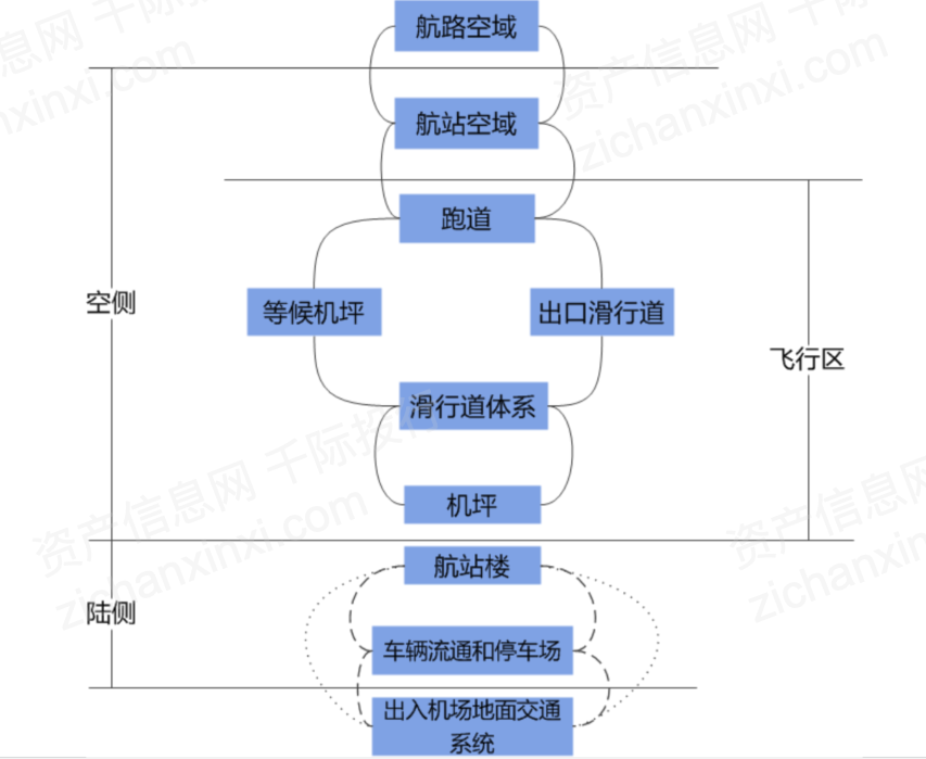 机场行业是指机场经营商以及提供相关服务的公司。机场系统包括空侧陆侧两部分。空侧是指飞行器区域,机场内旅客和其他公众不能自由进入的地区。陆侧是指机场内旅客和其他公众可以自由进入的地区。对候机建筑物而言,通常以登机旅客的安全检查口为界。